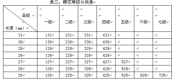 2.長度分級。長度分級用手扯尺量法進行,手扯纖維得到棉花的主體長度(一束纖維中含量最多的一組纖維的長度),用專用標尺測量棉束,得出棉花纖維的長度。各長度值均為保證長度,也就是說,25毫米表示棉花纖維長度為25.0—25.9毫米,26毫米表示棉花纖維長度為26.0—26.9毫米,以此類推。同時國標還規定,28毫米為長度標準級;五級棉花長度大于27毫米,按27毫米計;六、七級棉花長度均按25毫米計。品級分級與長度分級組合,可將棉花分為33個等級,構成棉花的等級序列。如國標規定的標準品是328,即表示品級為3級,長度為28.0—28.9毫米的棉花。